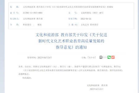 文化和旅游部教育部关于印发《关于促进新时代文化艺术职业教育高质量发展的指导意见》文化和旅游部教育部关于印发《关于促进新时代文化艺术职业教育高质量发展的指导意见》的通知各省、自治区、直辖市文化和旅游厅(局)、教育厅(委),新疆生产建设兵团文化体育广电和旅游局、教育局:《关于促进新时代文化艺术职业教育高质量发展的指导意见》已经文化和旅游部、教育部同意,现印发给你们,请遵照执行。特此…2022-05-02