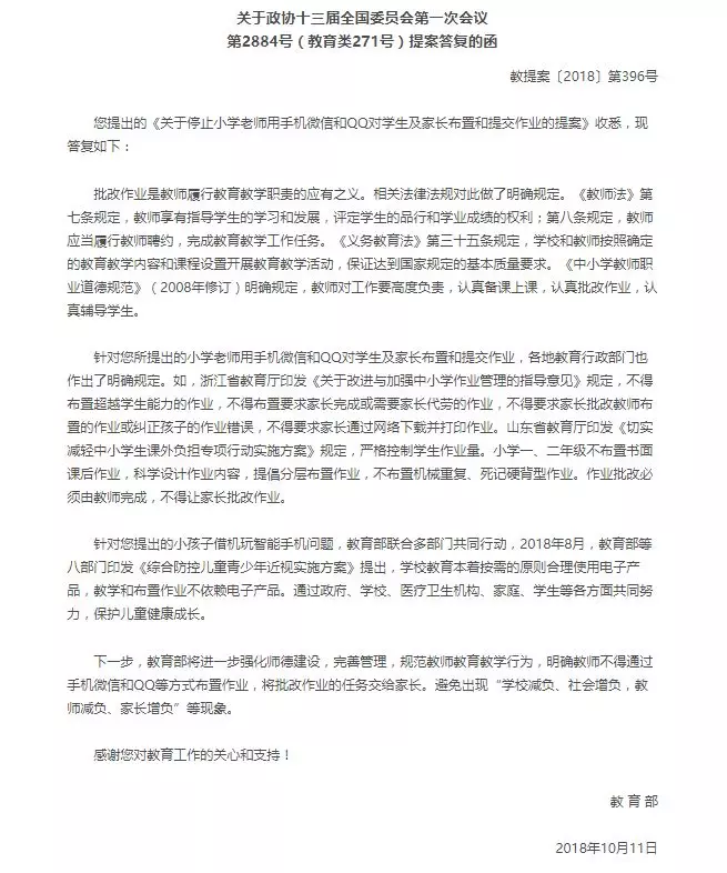 作为一个从未在微信QQ上布置过作业,也从不要求家长批改作业的老师骄傲的说:这个规定早该执行了!第一,我向来认为基础教育阶段的孩子应该尽可能少使用手机,作为老师,在孩子们面前也是尽可能以身作则。第二,家长批改后的作业看不出孩子们学习的真实情况,不能很好的对教学效果进行反馈,不利于老师及时调整教育内容方式与进度。家长可以不定期在工作时间向老师咨询孩子的学习情况,也可以经常翻阅孩子的作业本,通过老师的批改情况了解孩子学习动态。