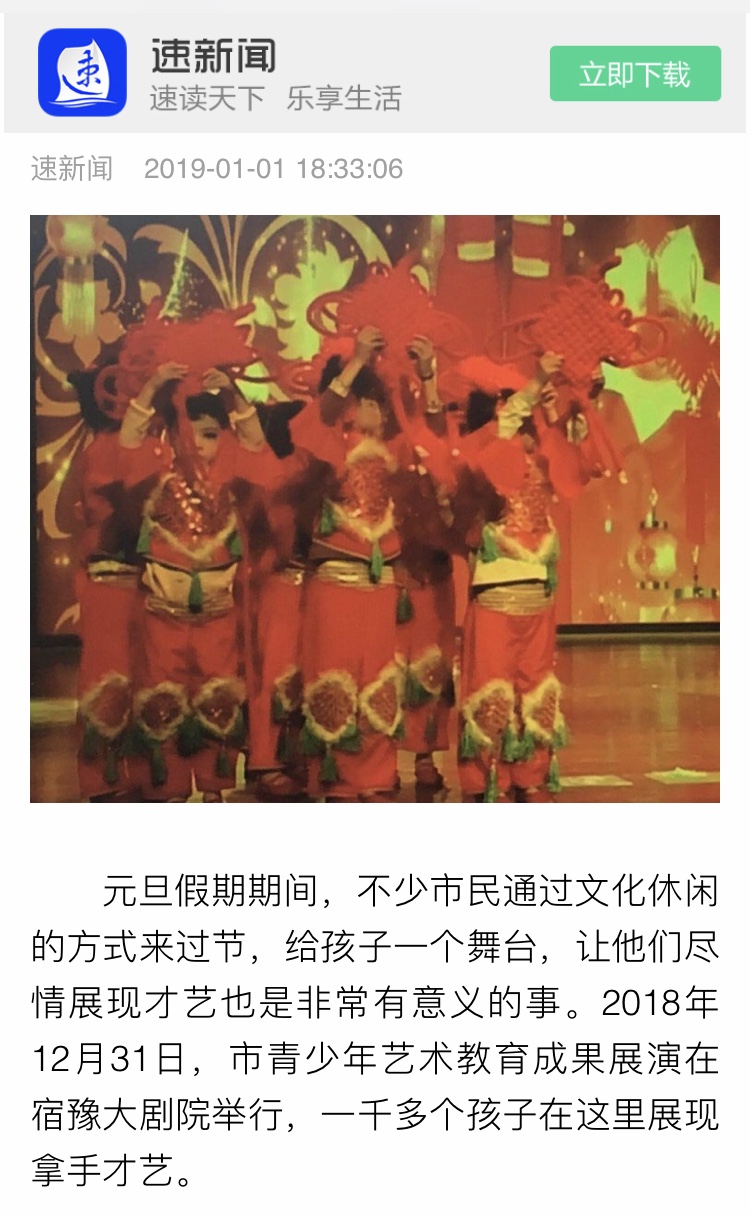 12月31日早上,清风贺喜无言语,阳光流溢暖花天。宿迁市一千两百余名优秀青少年代表集中在宿豫大剧院参加了宿迁市青少年艺术教育成果展演活动。