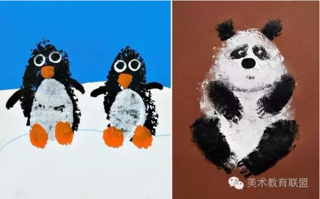 也就是把腳掌或手掌浸泡在顏料中,并在纸上拓印出來。然后再画出更多细节。