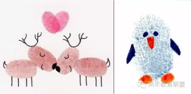 画如其名。只需要在手指上涂上薄薄一层顏料,然后拓印。再用色笔加上几条线,就大功告成!