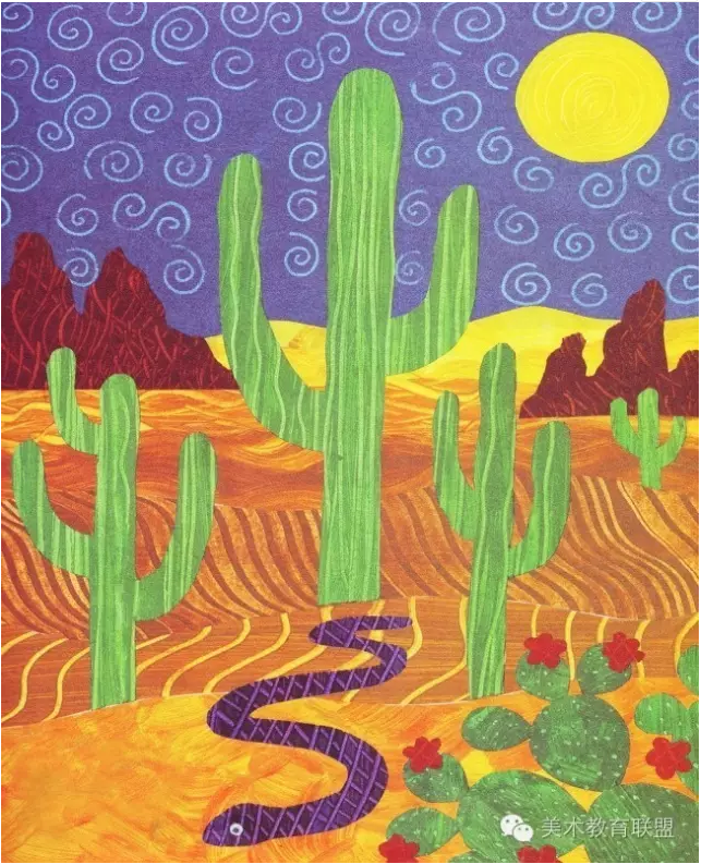 用海绵沾一些浓稠的水彩顏料印在画纸上,再稍加造型处理,孩子就能画出风景、花朵、或动物了。